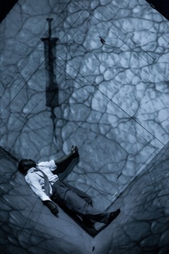 La saison du TNM se termine en un véritable feu d’artifice, au sens quasiment littéral du terme, avec une expérience « immersive » proposée par Robert Lepage, fondateur de la compagnie Ex Machina (quel nom extraordinaire ; Lepage agit bien comme un Deus ex machina en faisant le lien entre la logique du théâtre grec et les nouvelles technologies), qui la dirige dans la reprise de sa pièce Les aiguilles et l’opium. En fait, les appellations « pièce » ou « théâtre » sont ici relativement mal adaptées : l’argument est limité, les personnages, qu’ils soient encore vivants aujourd’hui (Juliette Greco, en 1949), morts (Jean Cocteau et Miles Davis, également en 1949) ou imaginaires (Robert — autofiction quand tu nous tiens, le comédien québécois interprété par Marc Labrèche, en 1989), n’en sont pas réellement, mais représentent plutôt, au choix, des archétypes, des spectres, des rêves, des incarnations artistiques ou des fantasmes littéralement illuminés par la magie de la mise en scène de Lepage et par ses choix scénographiques : Miles incarné — hommage aux arts circassiens — par un extraordinaire acrobate muet, Wellesley Robertson III, Juliette dont on n’apercevra finalement que la silhouette et dont l’interprète, malgré une présence que j’ai trouvée intéressante, n’est même pas nommée, ni dans le programme, ni dans les crédits (!), et Cocteau, toujours en peine de la mort soudaine de Radiguet en 1923 l’ayant laissé désespéré, découragé et en proie à l’opium qui, tel un ange, vole au-dessus de l’Atlantique de retour de New York alors que Davis fuit Paris et un amour impossible pour retourner dans l’Amérique raciste des années 50 vivre une longue chute et une déchéance sans fin dans la drogue tout en produisant l’une des œuvres musicales les plus géniales du XXe siècle.