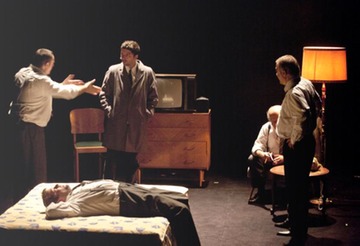 La transition entre les différents tableaux est marquée par un noir et par la diffusion de musiques. Chaque scène représente une chambre d’hôtel différente au sein de laquelle on peut, en général, distinguer un téléviseur, un lit et une armoire. Les personnages pénètrent sur la scène soit côté jardin, soit par le fond de scène, et la scénographie, comme souvent chez Pommerat, se modifie pendant les noirs avec une rapidité et une discrétion impressionnantes. En revanche, un extrait vidéo sur un écran blanc en devant de scène montrant un enchaînement de routes et de portes d’immeubles représentant une journée de travail en accéléré m’a beaucoup moins convaincu (comme c’est souvent le cas avec les insertions de séquences vidéo dont il faut vraiment qu’elles soient « ultrapertinentes » pour emporter mon adhésion). Le lit constitue le point de rassemblement des vendeurs, symbole de repos et de détente après une journée de labeur, ou de rassemblement à l’aube d’une nouvelle journée. La télévision joue également un rôle capital, en permettant aux personnages, et donc au spectateur, de se projeter dans un contexte social, politique et économique. L’éclairage est produit, soit par des lampes présentes sur scène lorsque l’action se déroule le soir, soit, lorsque l’action se passe le matin, par une lumière blanchâtre en plongée, souvent striée, pour montrer qu’il s’agit de la lumière du jour que laisse passer les fenêtres des chambres. D’une manière générale, comme c’est presque toujours le cas chez Pommerat, l’éclairage est relativement sombre, faisant ainsi ressortir une sensation où se mêlent ambigüité, étrangeté, fantasmagorie et inquiétude. Cette lumière ne permet souvent pas de distinguer réellement les acteurs et nous oblige à les reconnaître à leur silhouette ou à certains traits caractéristiques — le gros, le grand, celui qui porte des lunettes ou le chauve —, les scènes prenant alors une couleur onirique, une impression que l’on a souvent chez Pommerat, notamment à cause de leur enchaînement extrêmement rapide qui constitue une véritable prouesse technique (bravo à tous les techniciens concernés). Cette bascule permanente entre le rêve et la réalité brute (les vendeurs regardent chaque soir la télévision pour suivre l’actualité) est ressentie encore plus fortement grâce à l’exploitation occasionnelle d’une musique (bien) chantée plutôt légère. Globalement, la scénographie, la musique, les décors et la mise en scène concourent à donner une impression de plasticité tout à la fois déroutante et techniquement assez sidérante.